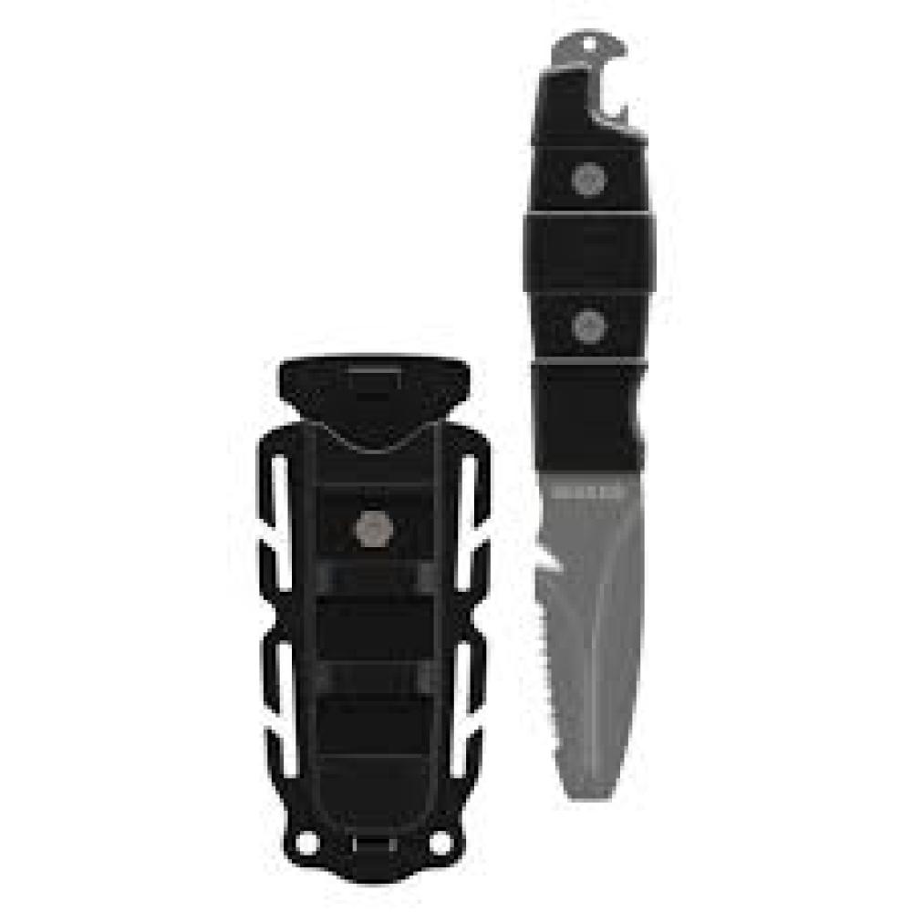 The Akua River Knife is a versatile tool for freshwater adventures, with a stainless steel blade featuring a blunt tip, serrated edge, and line cutter. It attaches to PFDs, deck bags, or belts, and has a quick release sheath for immediate access. It also includes a bottle opener and a glass breaker. Suitable for cutting fish, lures and ropes.