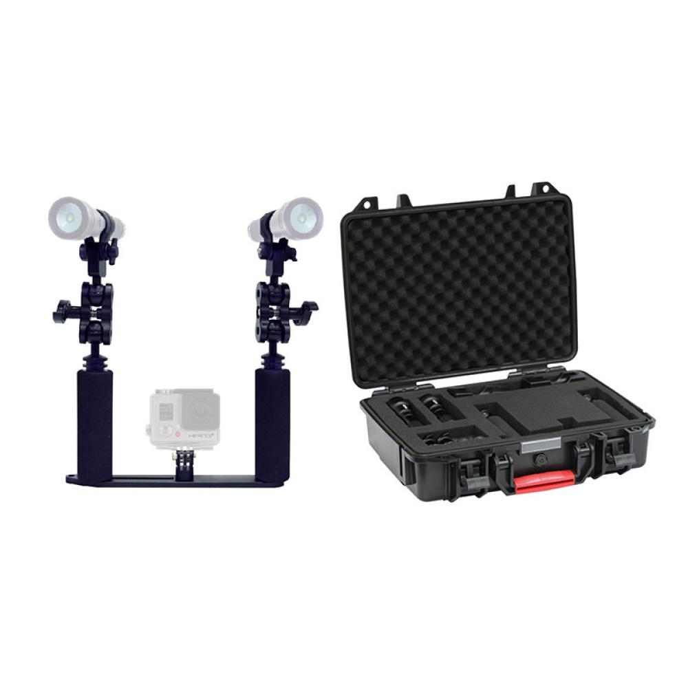 This light and camera tray combo kit is the perfect fit for the underwater photo / video enthusiast! Just add your camera (GP and standard 1/4 20? fittings included) and you’re ready to hit the water. This kit can also be expanded and upgraded to fit larger lights.